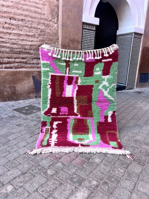 Et sjarmerende og fargerikt berberteppe. Klare, fine farger. Elsker kombinasjon av grønn og burgunder. Passer perfekt i små rom. Aud er fra Azilal og knyttet for hånd i ren ull.