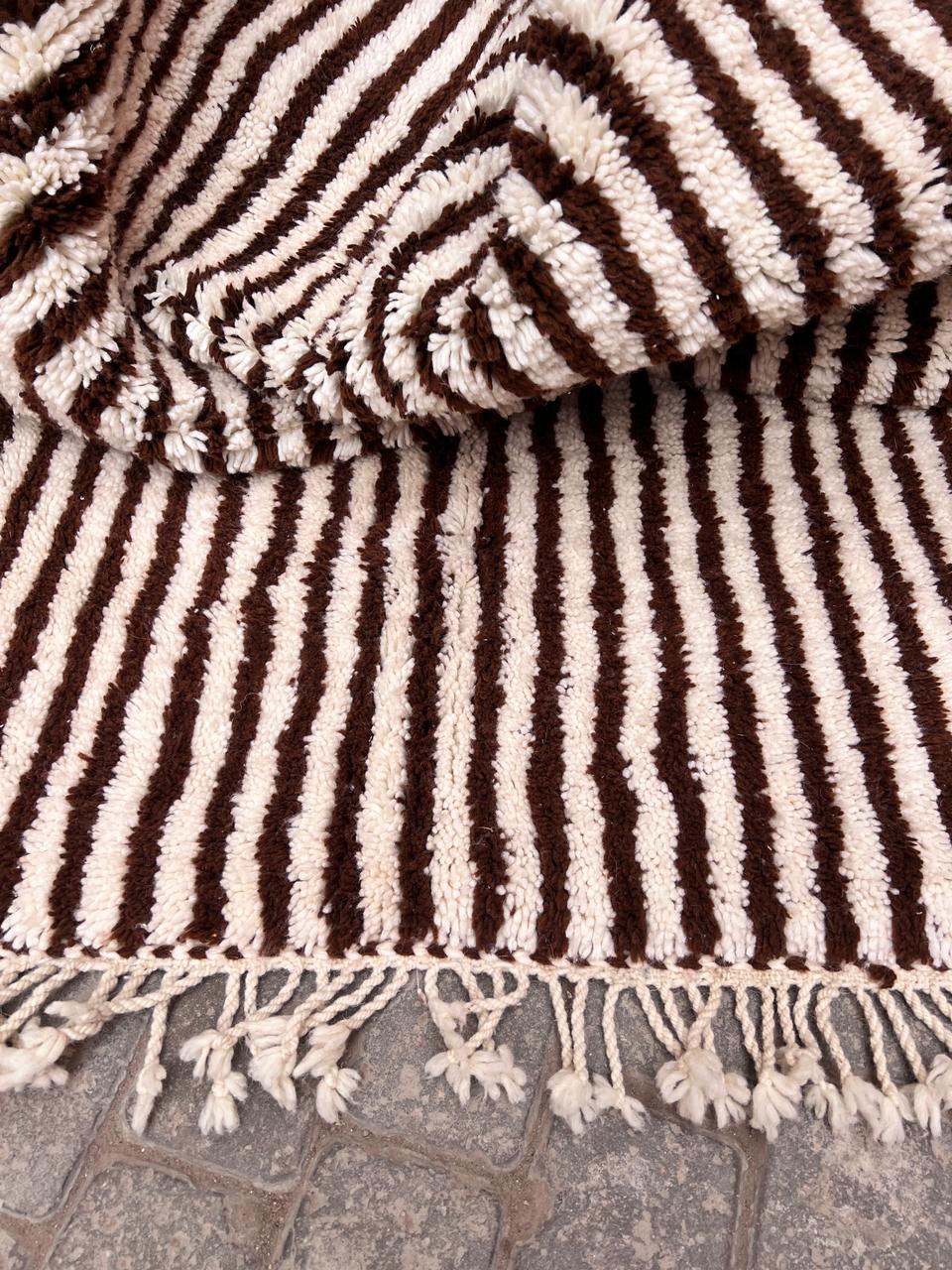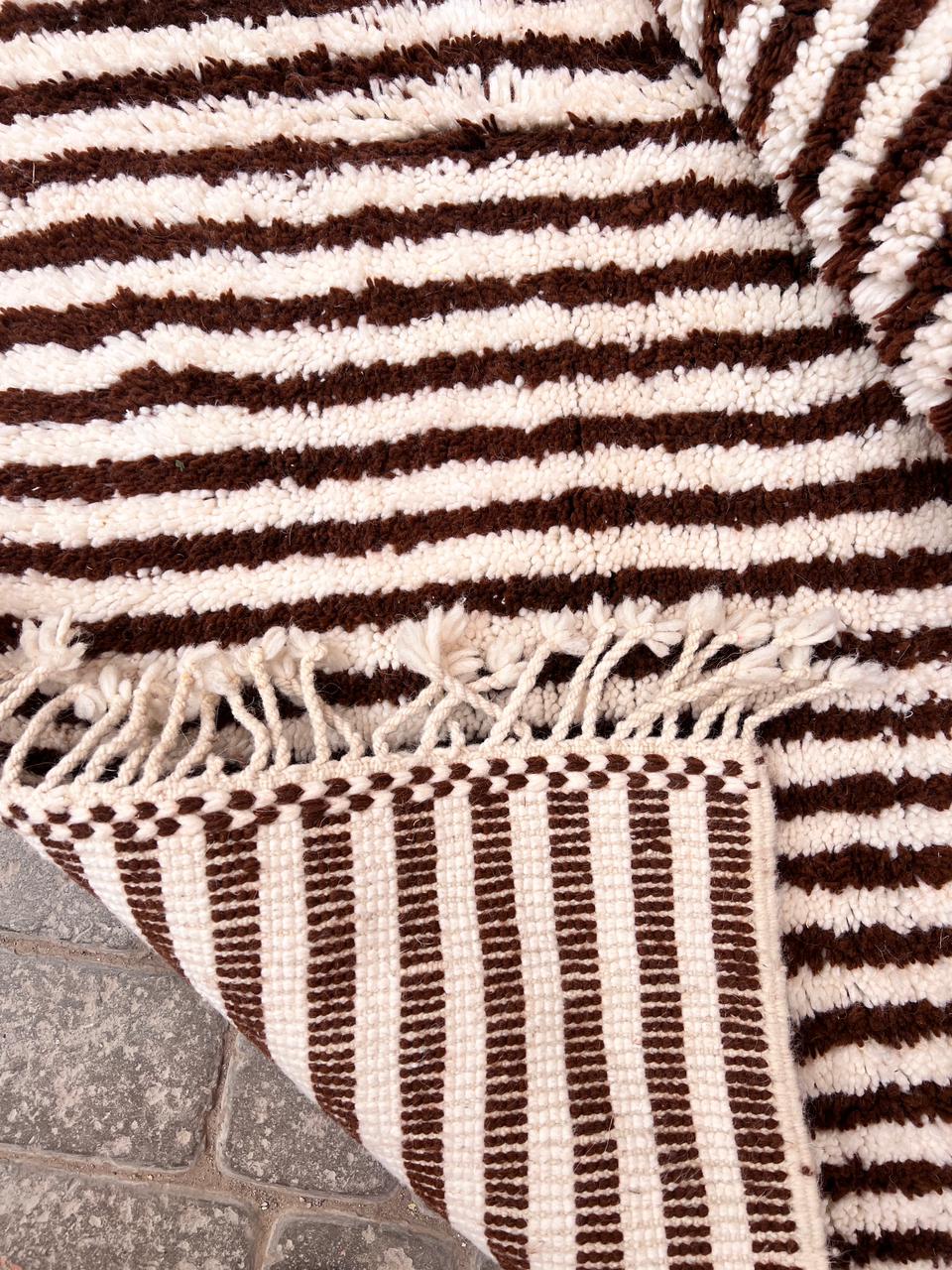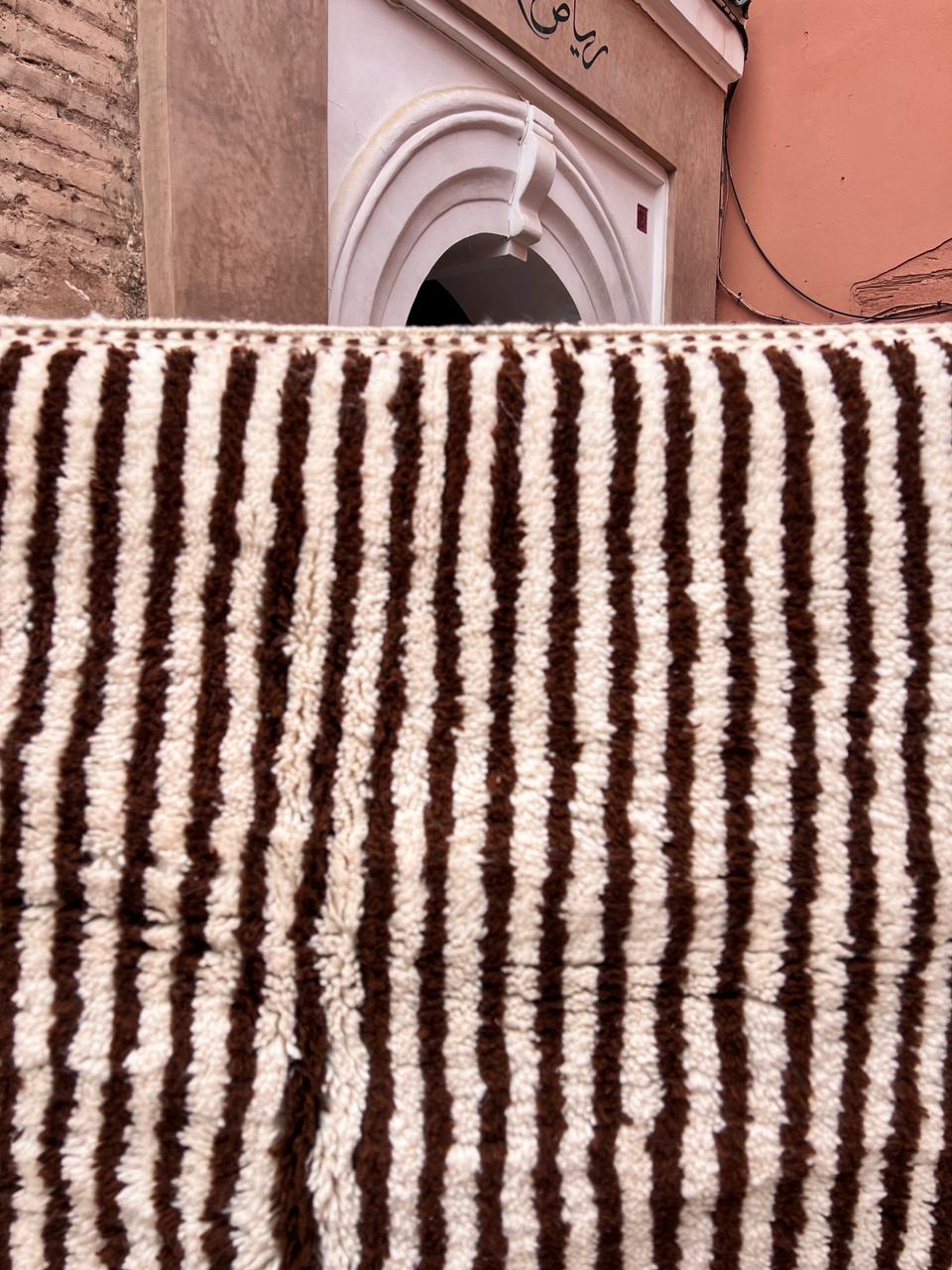 Et klassisk Beni Ourain-teppe som er knyttet for hånd i myk og tykk ull. Dette har vi designet selv, naturhvit bunn med nydelige brune striper. One of a kind teppe som vil tilføre personlighet og varme til interiøret ditt.