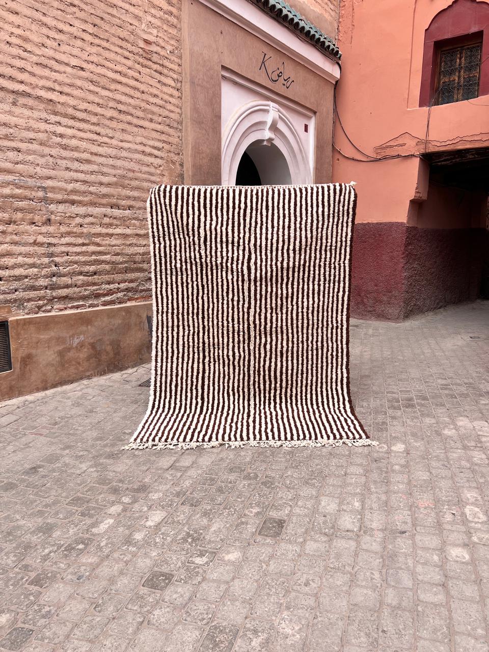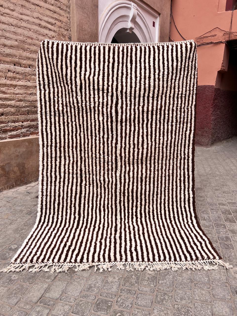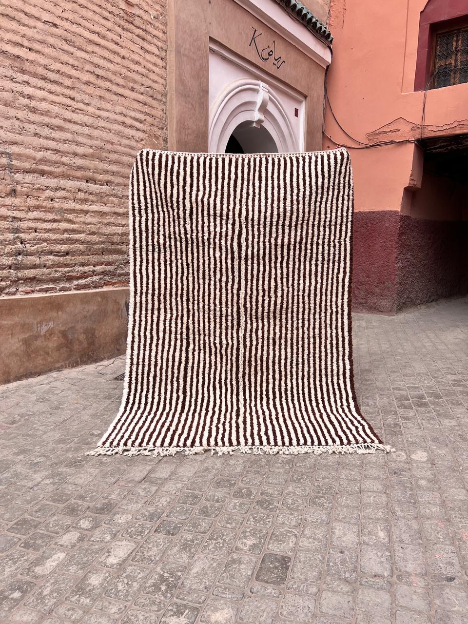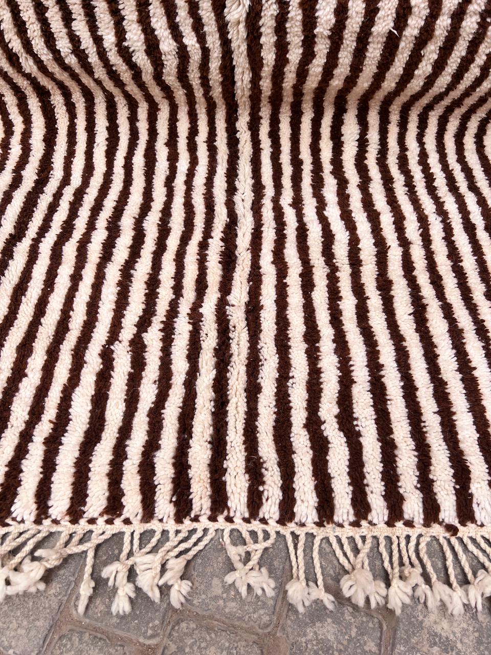 Et klassisk Beni Ourain-teppe som er knyttet for hånd i myk og tykk ull. Dette har vi designet selv, naturhvit bunn med nydelige brune striper. One of a kind teppe som vil tilføre personlighet og varme til interiøret ditt.