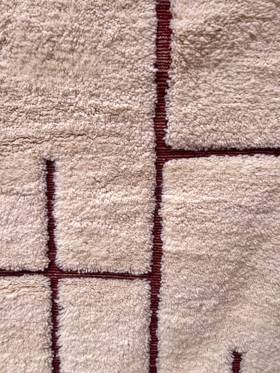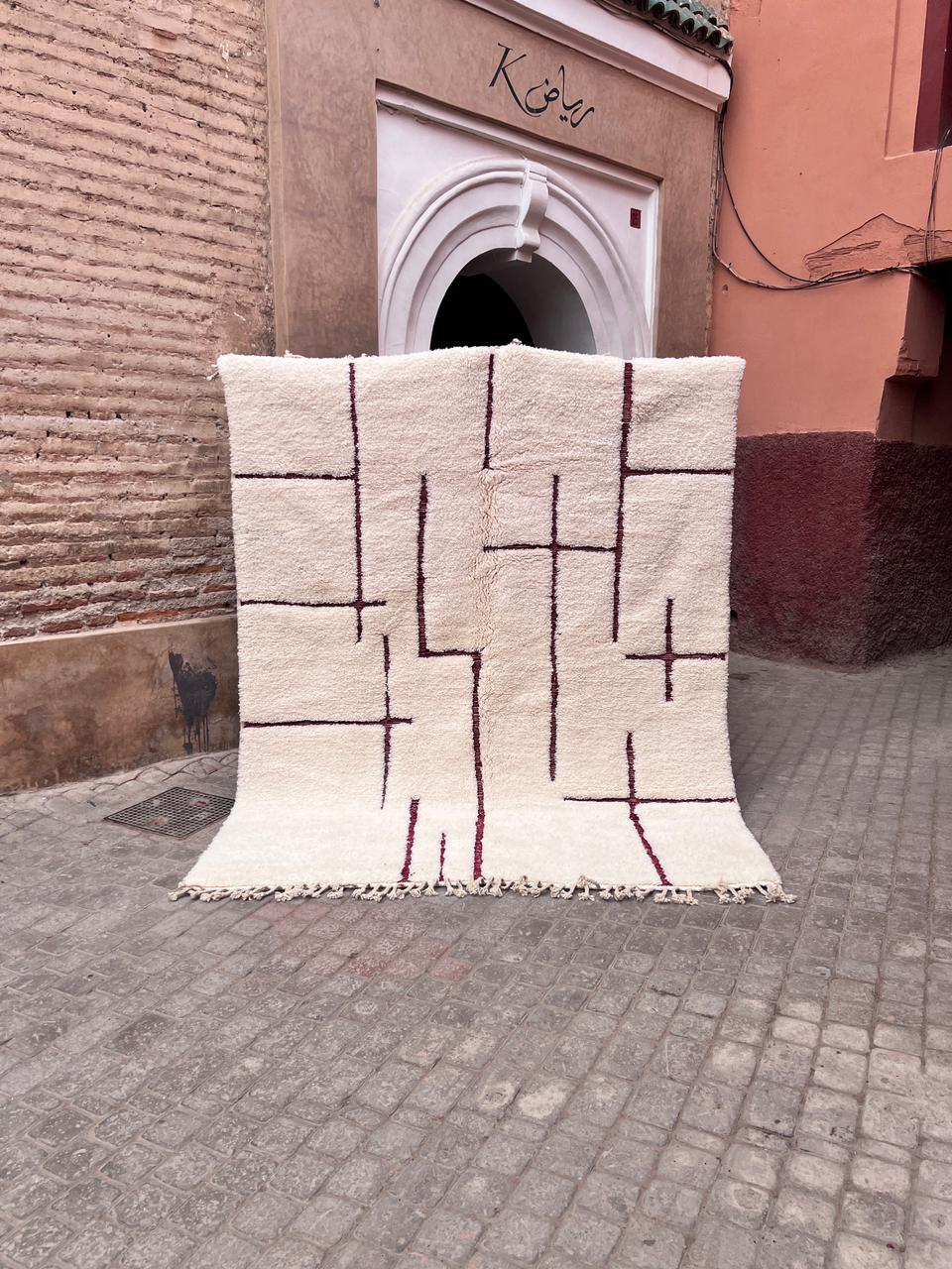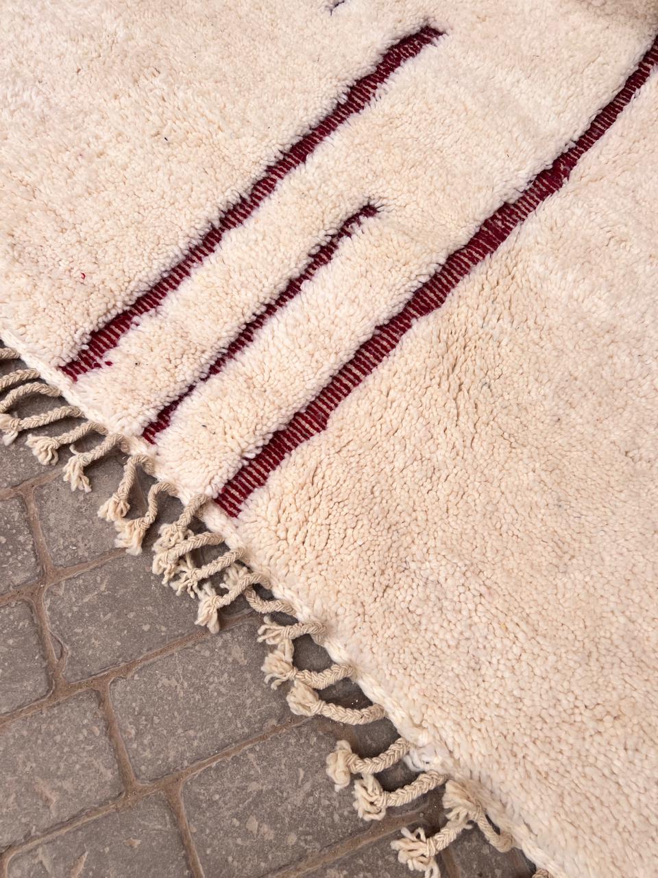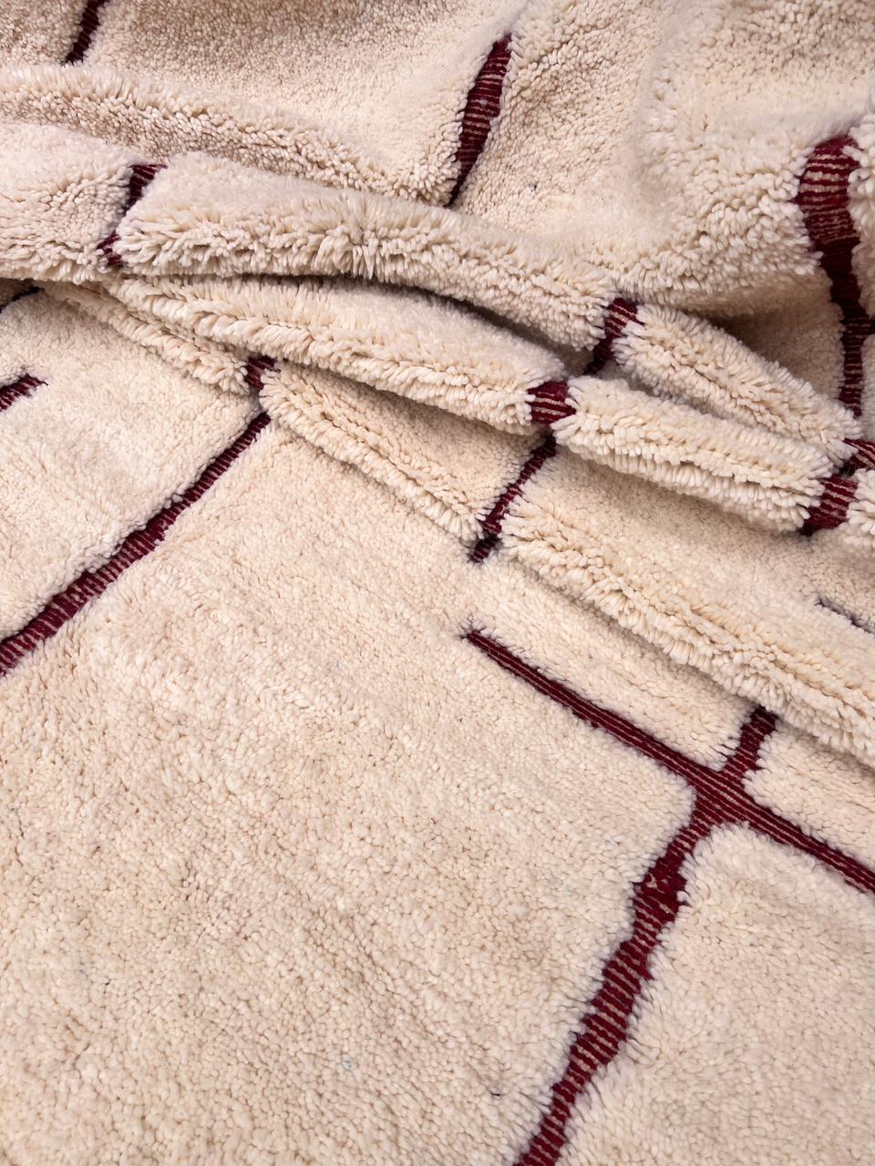 Et klassisk Beni Ourain-teppe som er knyttet for hånd i myk og tykk ull. Dette gulvteppet har så nydelige detaljer. One of a kind teppe som vil tilføre personlighet og varme til interiøret ditt. Nærmest kvadratisk. Nydelig burgunder i bunn. What´s not to love?