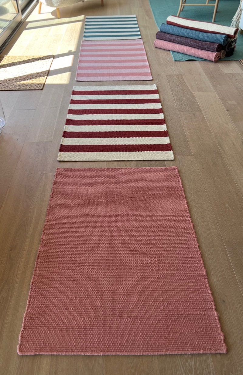 Vakre tepper vevd for hånd. Nydelig håndverk! Vi bruker New Zealand-ull i den fineste kvaliteten. Teppene er myke og slitesterke. Nydelig rosafarge. Ensfarget. Elsker disse små mattene som kan slenges hvor som helst!