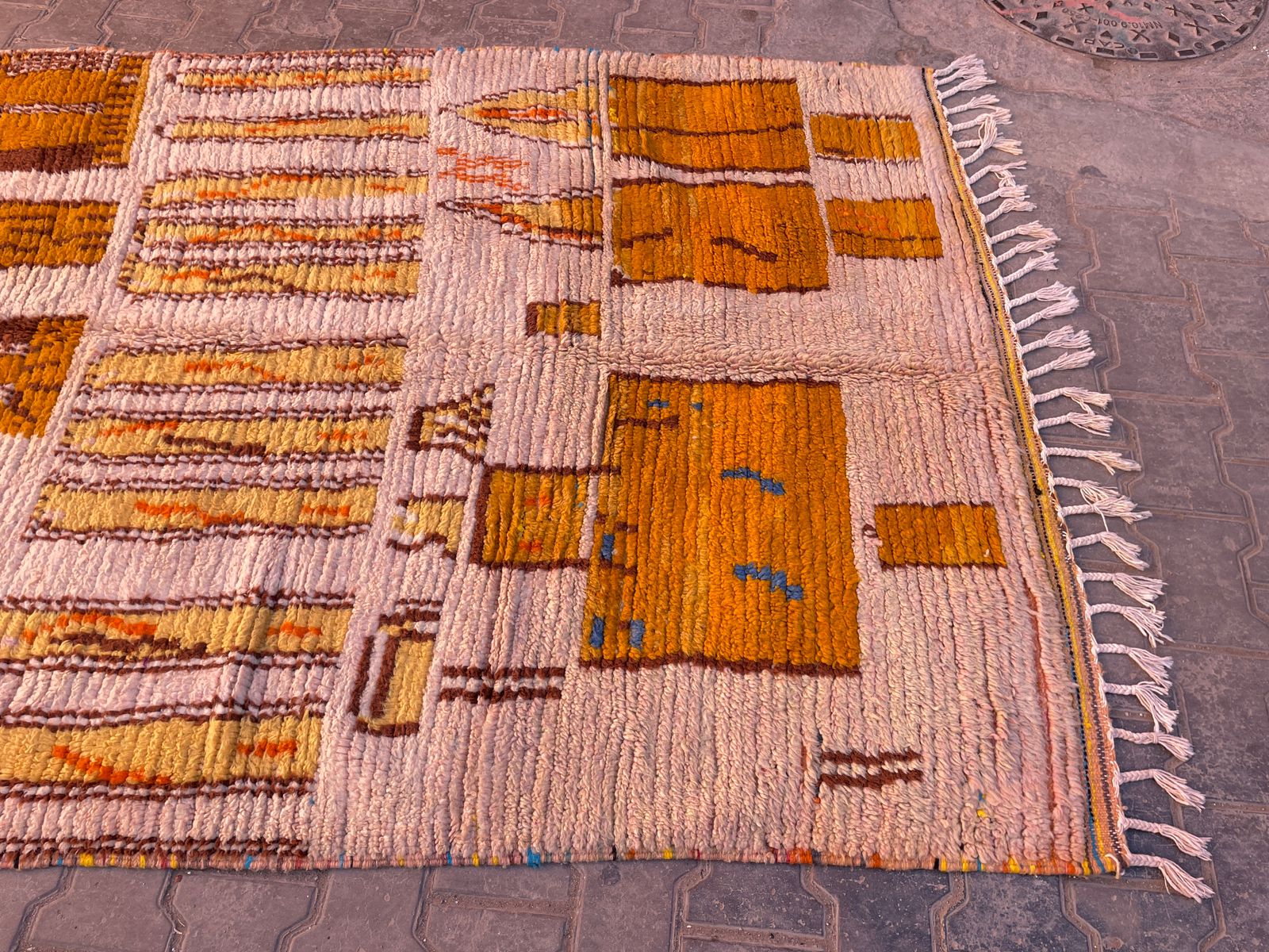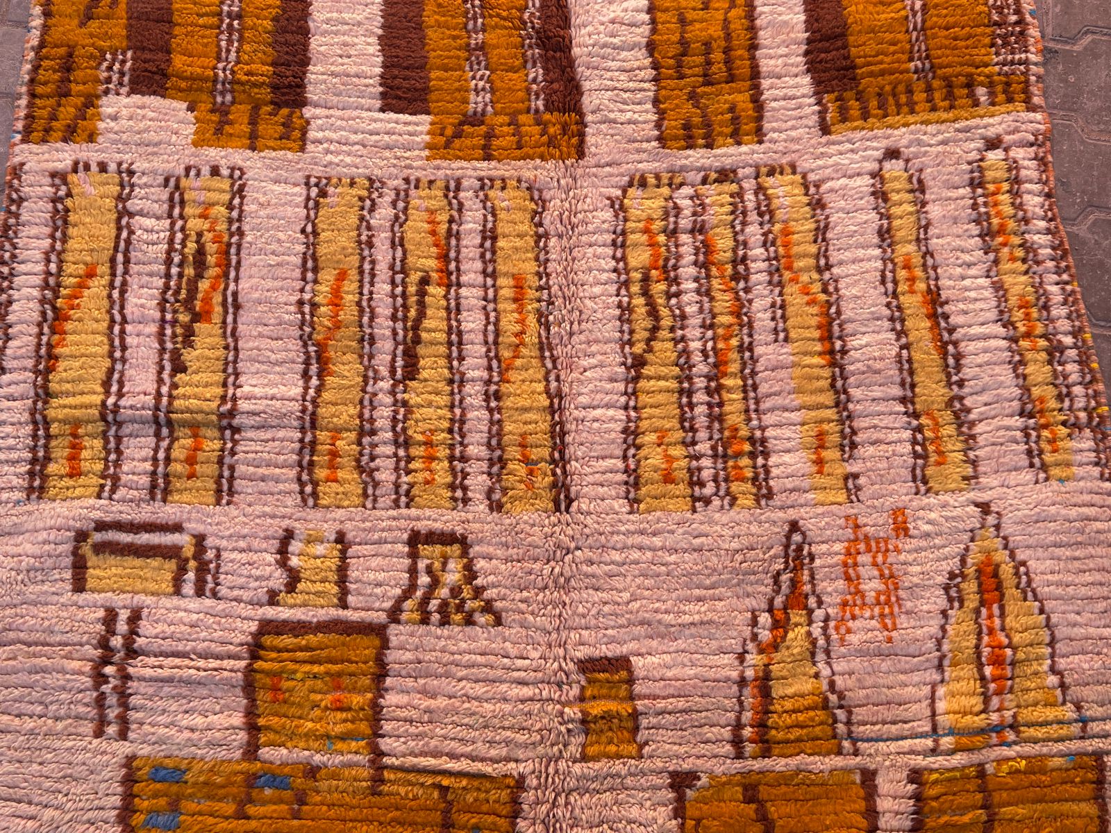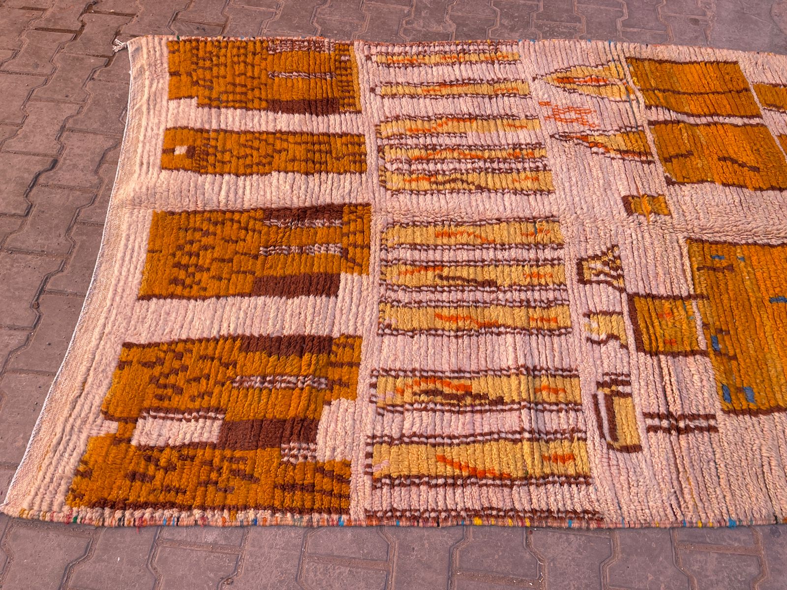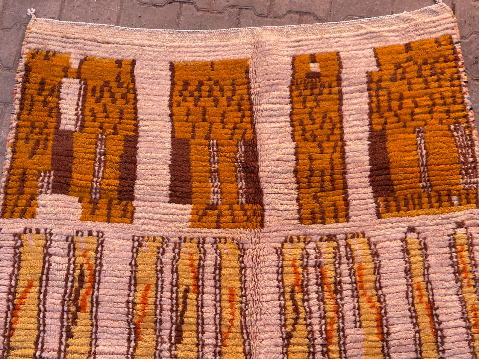 Unikt vintageteppe. Håndknyttet i 100% ull i Marokko. Fra Bejaad-regionen, der de er kjent for å lage tepper i sterke garver og med berbersymbolikk. Et teppe forteller ofte en historie. Fra landsbyen eller noe mer personlig. Disse teppene ble først sett i vestlig interiør på 70-tallet. Fantastiske fargekombinasjoner i type sennepsgult, smørgule, brunt og noe oransje.. Nydelig kvalitet. Disse marokkanske vintageteppene er sjelden vare, de er vanskelig å finne. Vil tilføre karakter og dybde til interiøret ditt. Samt skape soner og holde deg varm på føttene gjennom vinteren.
