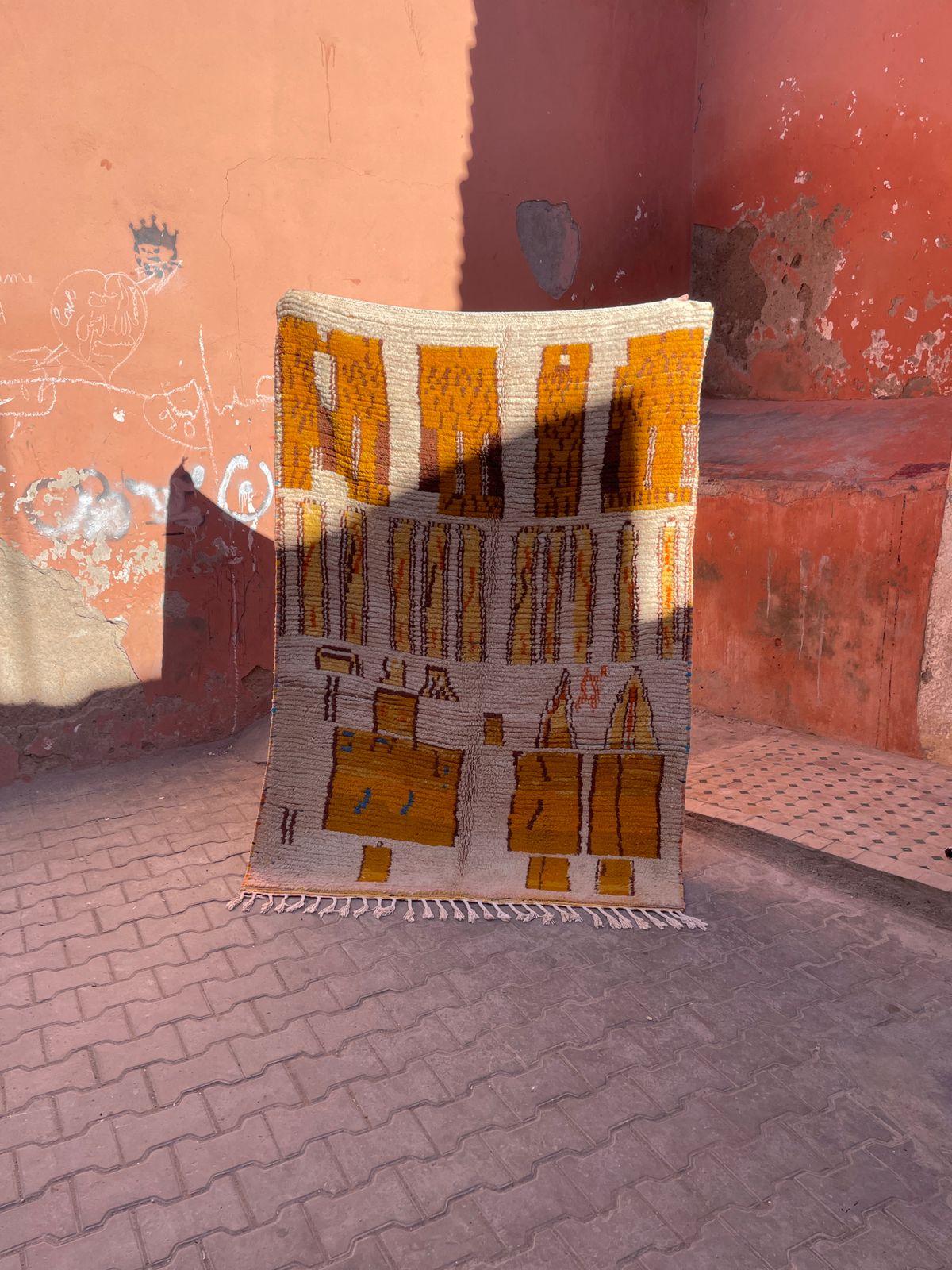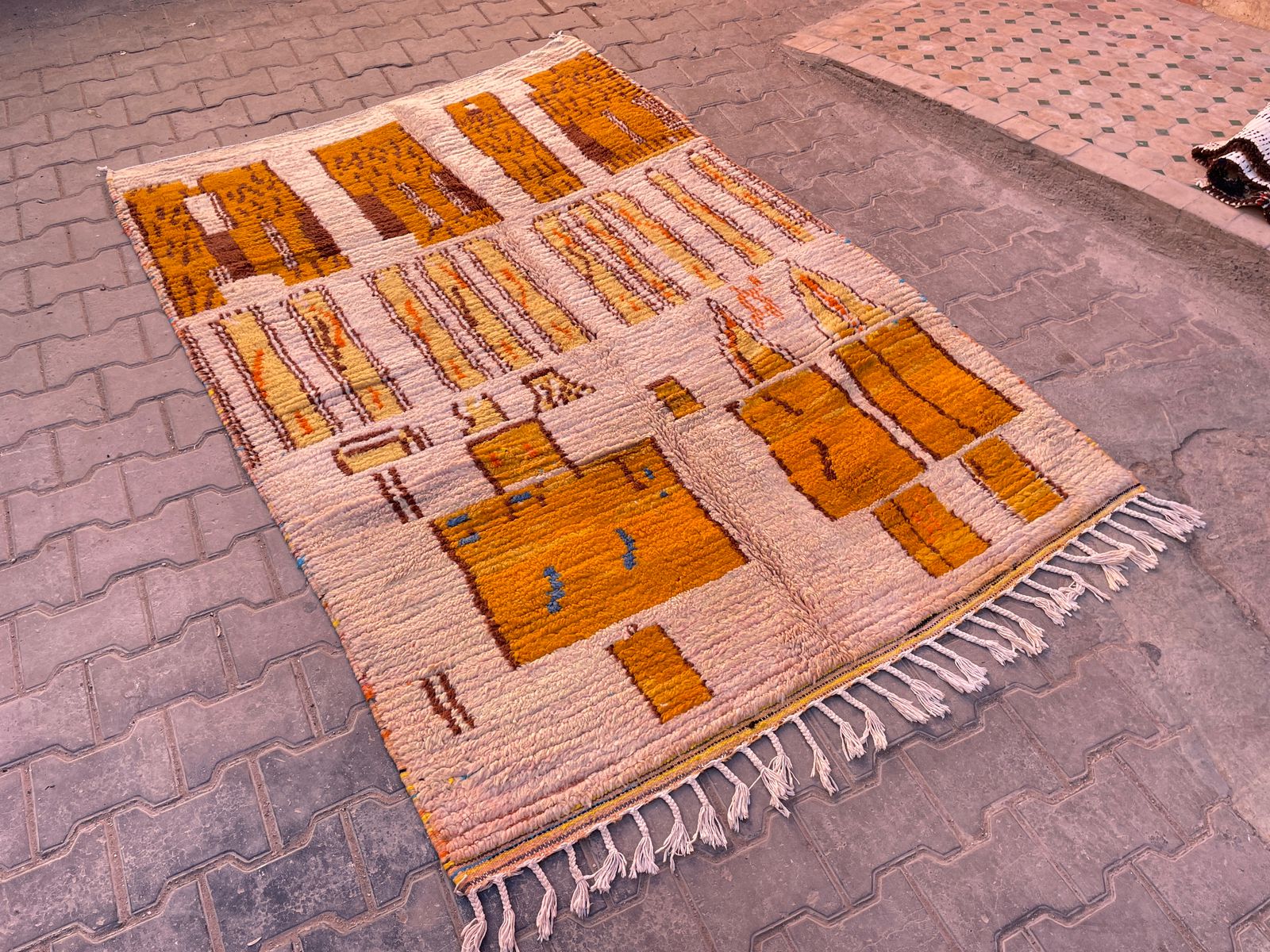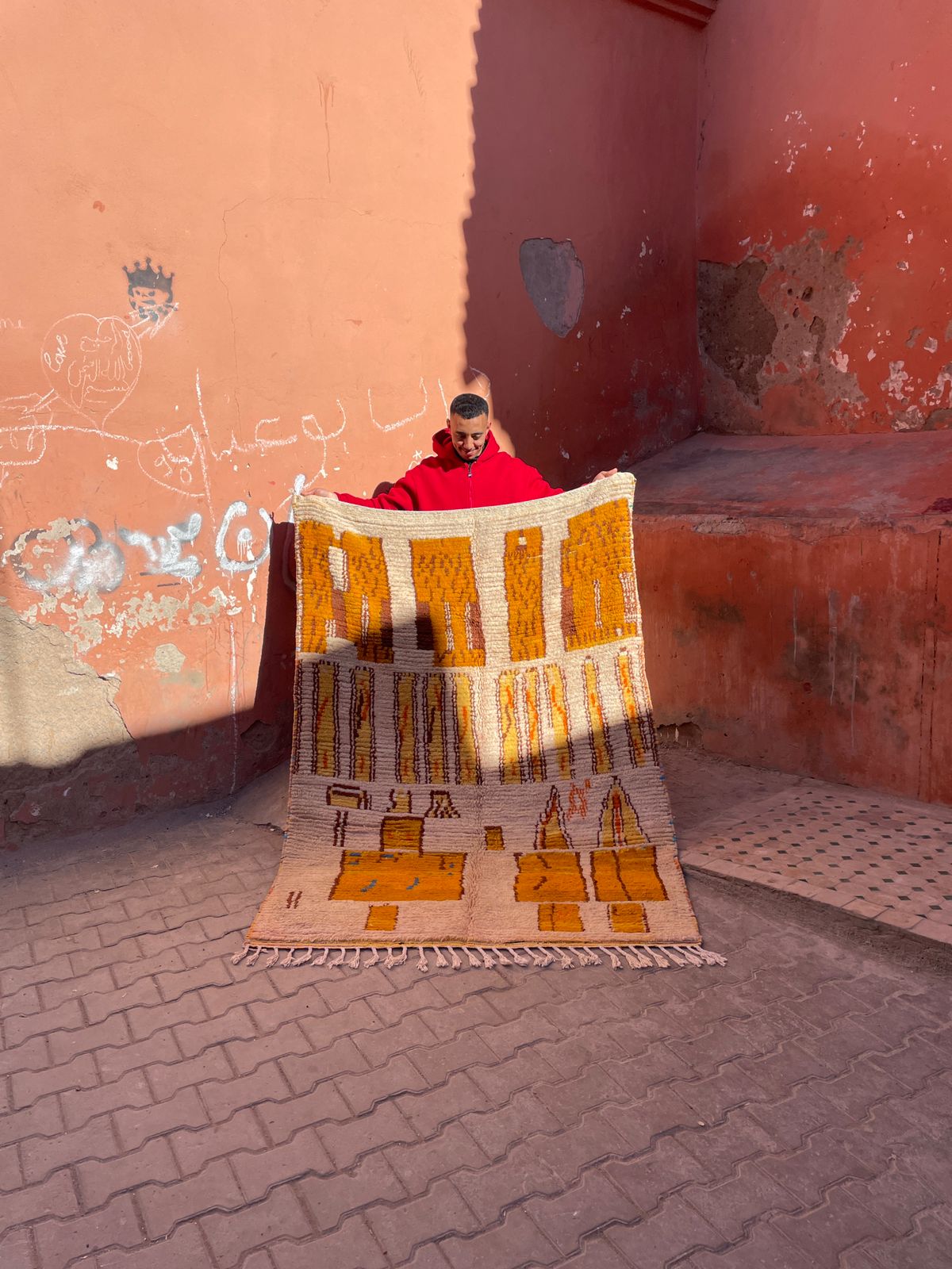 Unikt vintageteppe. Håndknyttet i 100% ull i Marokko. Fra Bejaad-regionen, der de er kjent for å lage tepper i sterke garver og med berbersymbolikk. Et teppe forteller ofte en historie. Fra landsbyen eller noe mer personlig. Disse teppene ble først sett i vestlig interiør på 70-tallet. Fantastiske fargekombinasjoner i type sennepsgult, smørgule, brunt og noe oransje.. Nydelig kvalitet. Disse marokkanske vintageteppene er sjelden vare, de er vanskelig å finne. Vil tilføre karakter og dybde til interiøret ditt. Samt skape soner og holde deg varm på føttene gjennom vinteren.