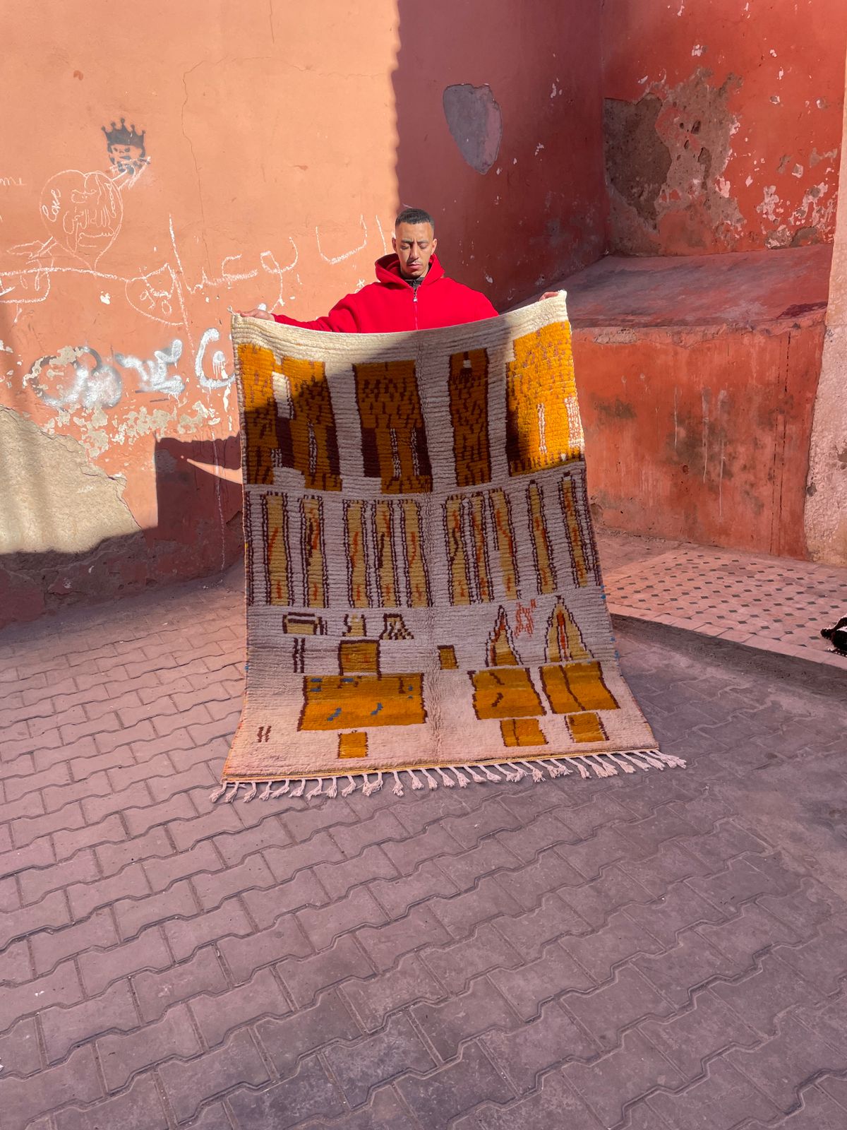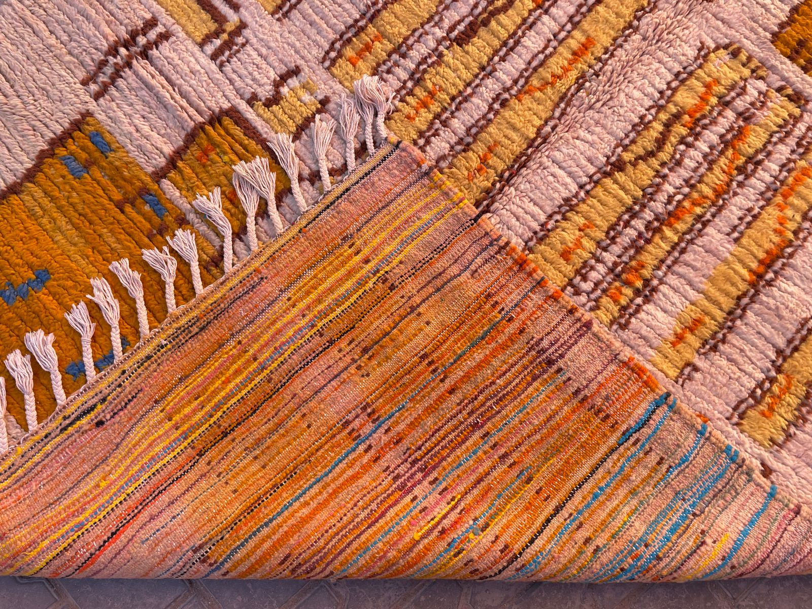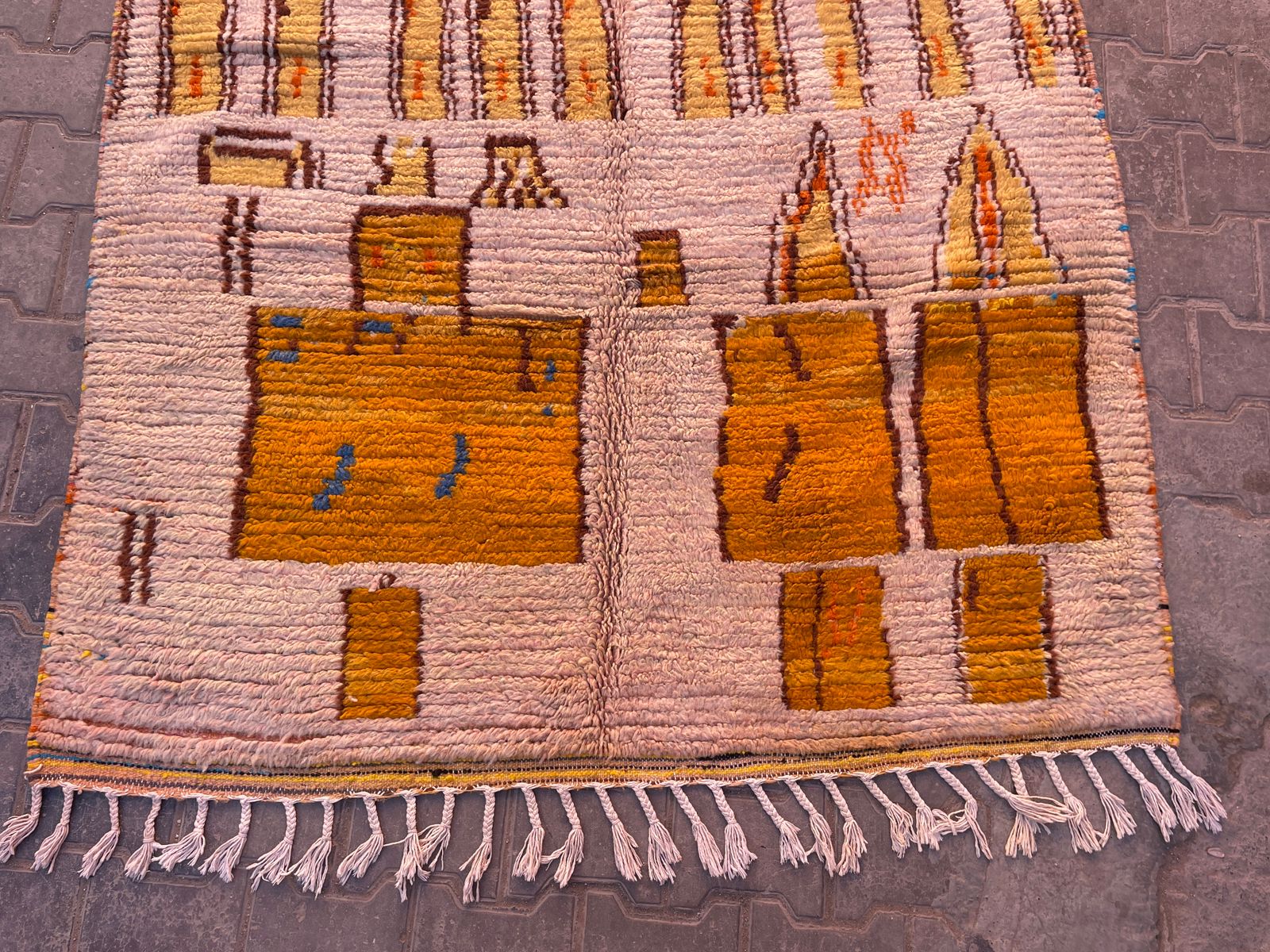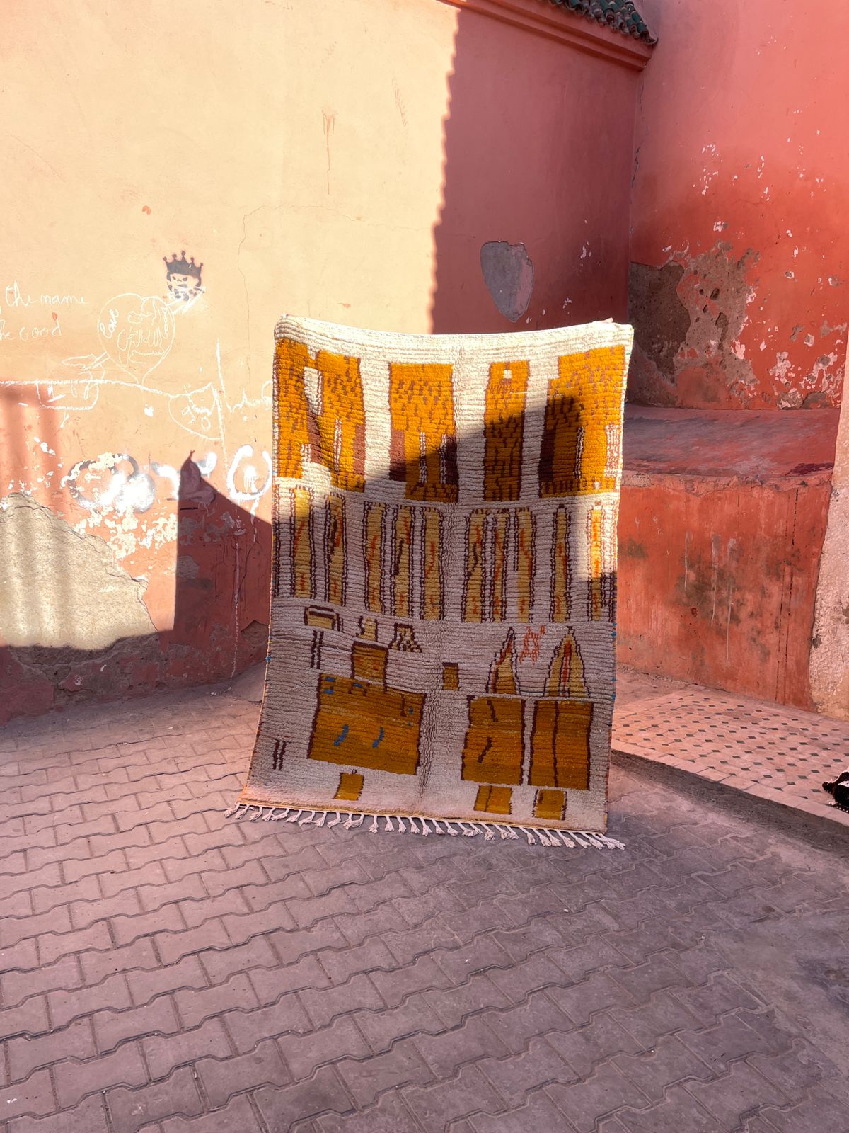 Unikt vintageteppe. Håndknyttet i 100% ull i Marokko. Fra Bejaad-regionen, der de er kjent for å lage tepper i sterke garver og med berbersymbolikk. Et teppe forteller ofte en historie. Fra landsbyen eller noe mer personlig. Disse teppene ble først sett i vestlig interiør på 70-tallet. Fantastiske fargekombinasjoner i type sennepsgult, smørgule, brunt og noe oransje.. Nydelig kvalitet. Disse marokkanske vintageteppene er sjelden vare, de er vanskelig å finne. Vil tilføre karakter og dybde til interiøret ditt. Samt skape soner og holde deg varm på føttene gjennom vinteren.
